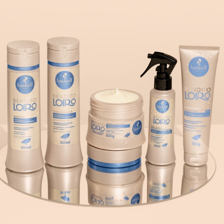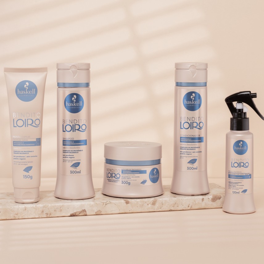Como utilizar o Kit Bendito LoiroAntes da lavagem, aplique a Proteína Capilar nos cabelos levemente úmidos, mecha por mecha. Deixe agir por 10 minutos. Em seguida, lave com o Shampoo Bendito Loiro, massageando suavemente o couro cabeludo. Enxágue bem. Aplique a Máscara de Tratamento, do comprimento às pontas. Deixe agir de 3 a 5 minutos e enxágue. Após a máscara, use o Condicionador Bendito Loiro para selar as cutículas. Deixe agir por 1 minuto e enxágue. Como os cabelos úmidos, aplique o Fluido Proteico no comprimento. Não enxágue e finalize como desejar.